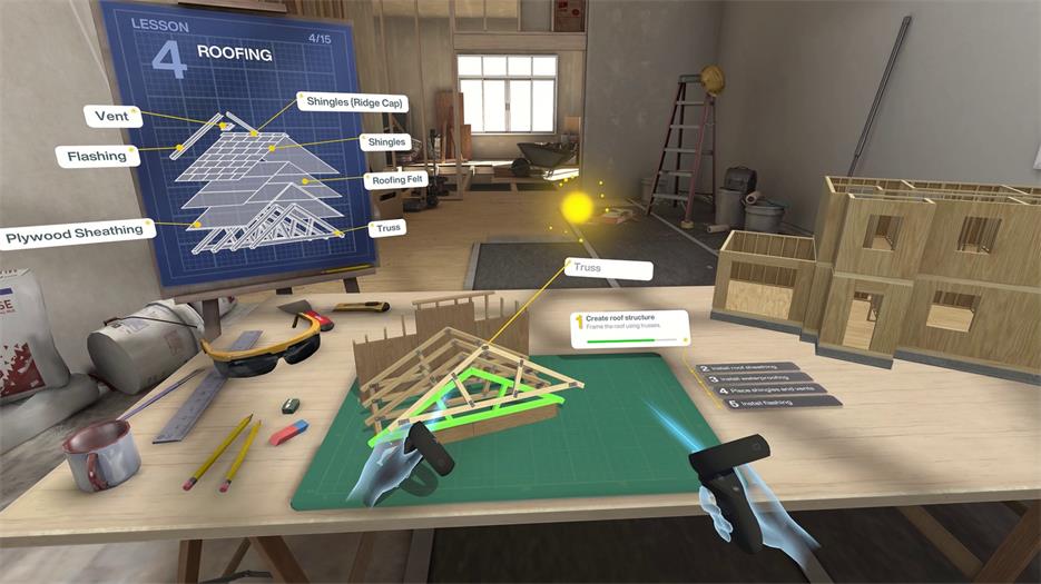 从基础开始,学习者组装地板、墙壁、门、窗、内饰、屋顶、电气部件等。随着每个主要部件的完成,虚拟家在学习者面前组装,反映了他们的进步,VR魔趣网。